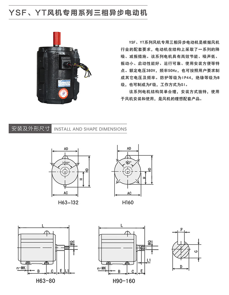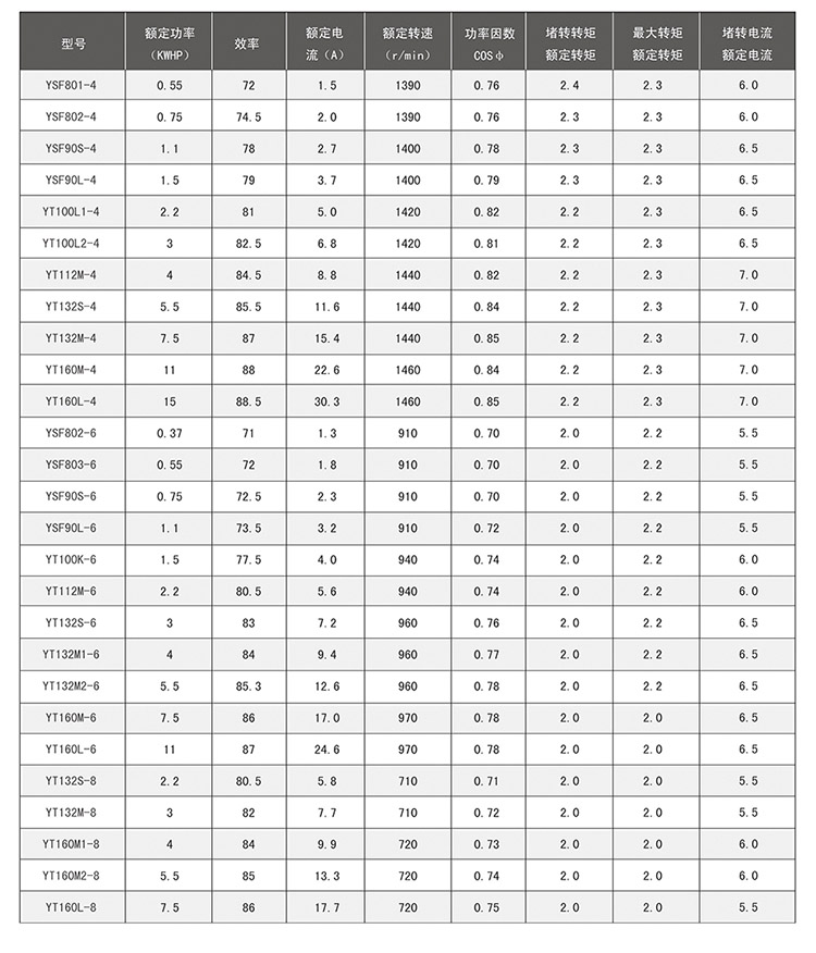 YT系列風機專用三相異步電動機是根據風機行業的配套要求,電動機在結構上采取了一系列的降噪、減振措施。該系列電機具有高效節能、噪聲低、振動小、起動性能好、運行可靠、使用安裝方便等特點。額定電壓380V、頻率50HZ,也可按用戶要求制成其它電壓及頻率。防護等級為IP44,絕緣等級為B級,也可制為F級,工作方式為S1。 該系列電機結構簡單合理,安裝方式好,適用于風機安裝和使用,是風機的理想配套產品。