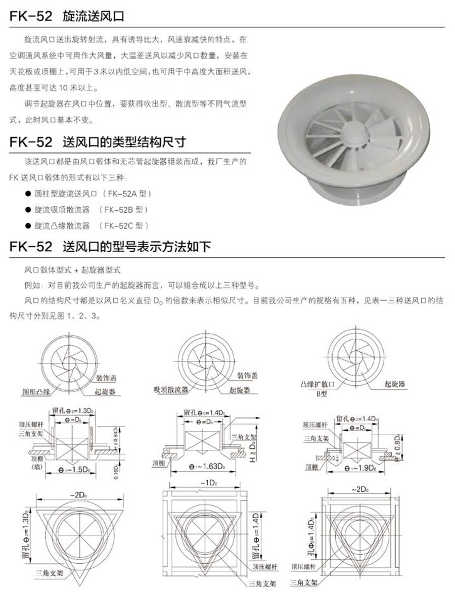 旋流風(fēng)口是空調(diào)系統(tǒng)中的一個(gè)送風(fēng)工具。在空調(diào)通風(fēng)系統(tǒng)中可用作大風(fēng)量,大溫差送風(fēng)以減少風(fēng)口數(shù)量,安裝在天花板或頂棚上,可用于3米以內(nèi)低空間,也可用二種高度大面積送風(fēng),高度甚至可達(dá)10米以上。 旋流風(fēng)口送出旋轉(zhuǎn)射流,具有誘導(dǎo)比大,風(fēng)速衰減快的特點(diǎn)。旋流風(fēng)口無(wú)論在供冷還是在供熱時(shí)均可通過(guò)調(diào)節(jié)送風(fēng)角度達(dá)到最佳的送風(fēng)效果,手動(dòng)旋流風(fēng)口和電動(dòng)旋流風(fēng)口均可適合工業(yè)廠房或高級(jí)活動(dòng)場(chǎng)所。旋流風(fēng)口既可安裝在層高很大的公共場(chǎng)所(如:工業(yè)廠房、機(jī)場(chǎng)、劇院、銀行營(yíng)業(yè)廳等),也可安裝在層高≥3.80m的室內(nèi)(如會(huì)議室),尤其適合于送風(fēng)溫差大范圍內(nèi)變化的場(chǎng)所。