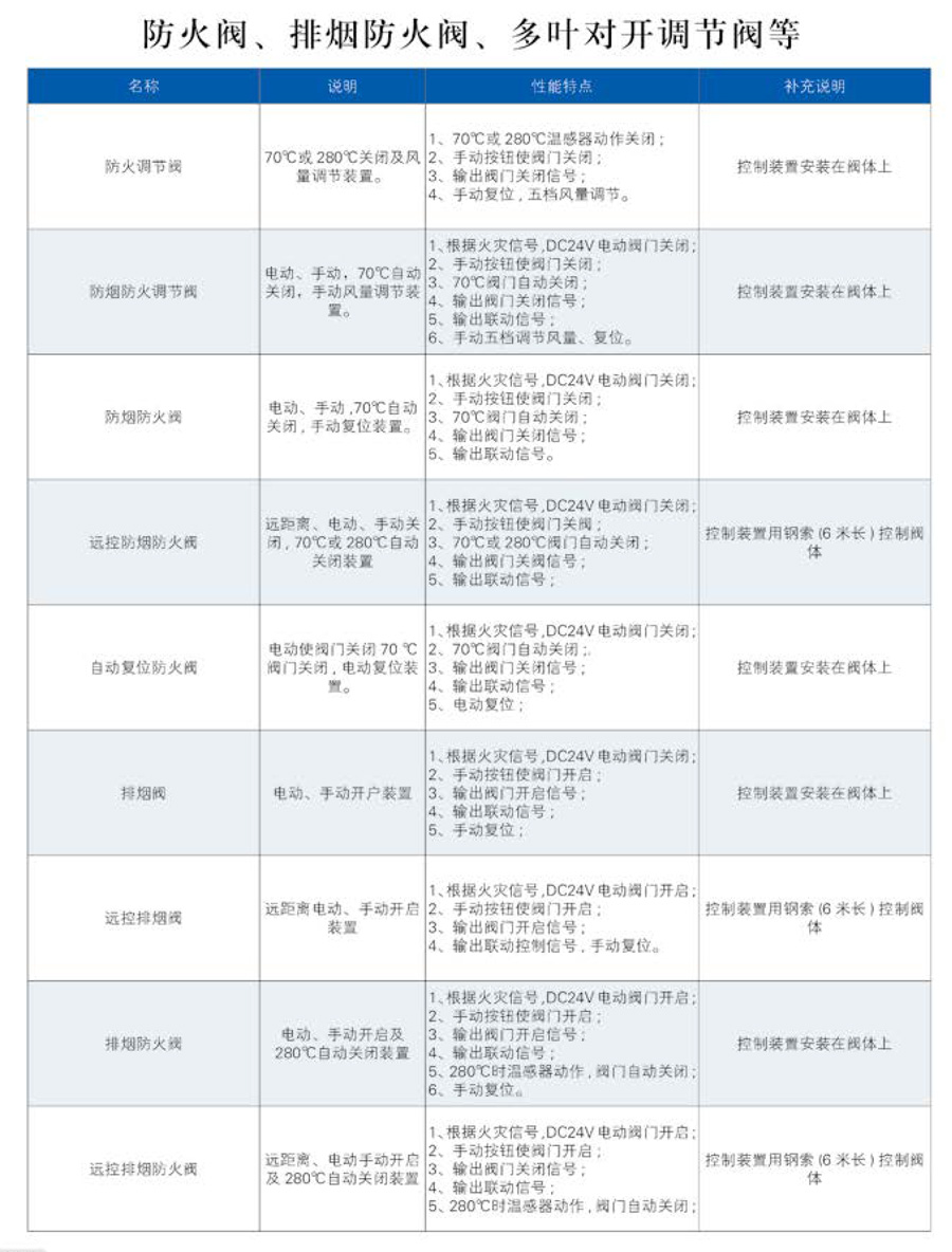 通常分為常開電動式、常開手動式、常閉電動式三種,均可輸出關閉電信號及啟動連鎖,熔斷關閉溫度均為280℃,風閥均可調節開度。