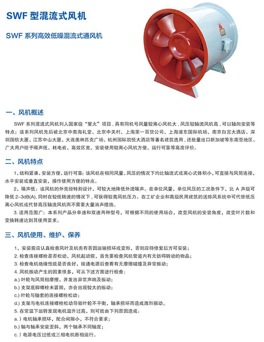 【SWF(B)】系列低噪節能混流通風機是介于軸流式和離心式通風機之間的一種新型風機,具有離心式風機的高壓力,軸流風機的大流量,效率高,節能好,噪聲低,安裝方便等特點。風機設計新穎,結構緊湊,體積小,重量輕,易安裝,風機可聯接管道和安裝在空調箱內。低壓離心風機,廣泛用于工業,民用建筑通風除塵等。HL3-2A系列混流通風機廣泛用于隧道、地下車庫、高級民用建筑、冶金、廠礦等場所的通風換氣及消防高溫排煙,特殊環境可選用防爆型混流風機。